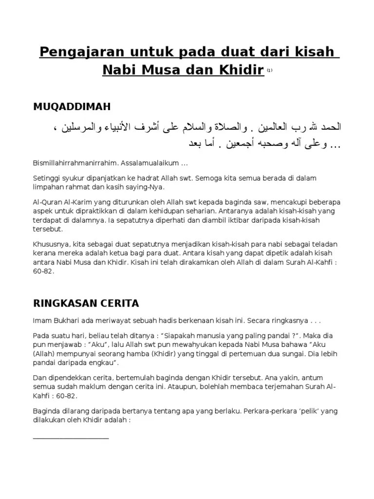 Yang lain dikirimnya belalang kutu katak dan darah ke tengah tengah kaum raja firaun. Akhirnya hubungan singkat guru dan murid ini pun berakhir dengan nabi musa yang semakin menyadari kesalahannya. Kemudian keduanya melanjutkan perjalanan dan bertemu dengan seorang anak yang sedang bermain dengan teman temanya. Nasihat khidir kepada musa dari umar bin al khattab radiyallahu anhu bahwa rasulullah shallallahu alaihi wa sallam bersabda saudaraku musa alaihissalam berkata wahai rabbi.