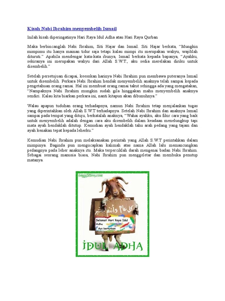 Hari raya qurban termasuk dari 2 perayaan besar dalam agama islam. Kisah nabi ibrahim as menyembelih anaknya nabi ismail as kisah nabi ibrahim sempena aidiladha nabi ibrahim as adalah salah seorang nabi yang termasuk ke dalam ulul azmi yaitu golongan nabi yang salahsatu cirinya memiliki kesabaran lebih dibanding manusia biasa. Di setiap tahunnya orang orang yang memiliki rezeki lebih dianjurkan untuk berkurban dan membagikan daging kurban kepada orang orang. Salah satu kisah nabi ibrahim mengenai perayaan idul adha bersama anaknya ismail.