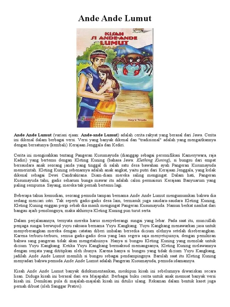 Tolong panggilkan gadis yang berbaju kuning itu kemari seru ande ande lumut sambil menunjuk ke arah seorang gadis yang duduk paling belakang. Cerita dongeng pendek anak jawa timur kisah rakyat ande ande lumut. Memang benar ketiga putri nyai cantik semua. Andeande lumutsebelumnya kakak pernah menceritakan versi lain dari dongeng anak ande ande lumut adik adik bisa mencari legenda rakyat tersebut di blog ini.