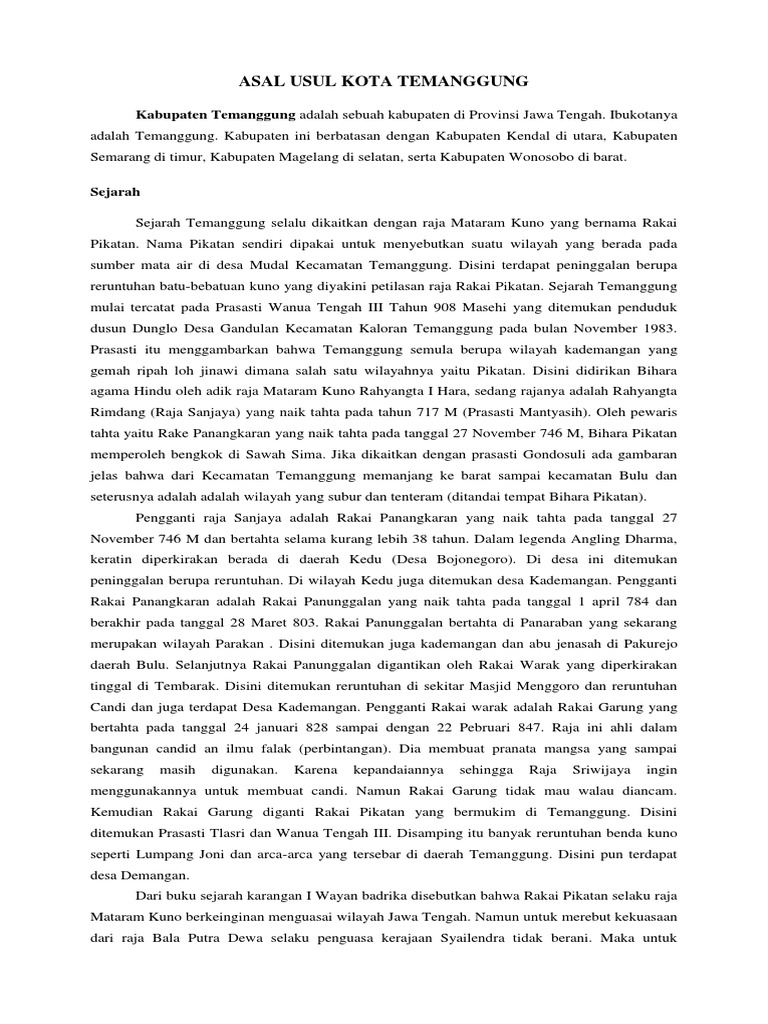 Berdasarkan cerita tutur dan khazanah arsip yang dimiliki oleh Dinas Kearsipan dan Perpustakaan sebagai salah satu upaya menyelamatkan sejarah lisan dan kearifan lokal yang menceritakan tentang kisah asal usul nama kelurahan di Kota Pekalongan. Sinau Budaya Jawa. Sejarah Temanggung selalu dikaitkan dengan Raja Mataram Kuno yang bernama Rakai Pikatan.