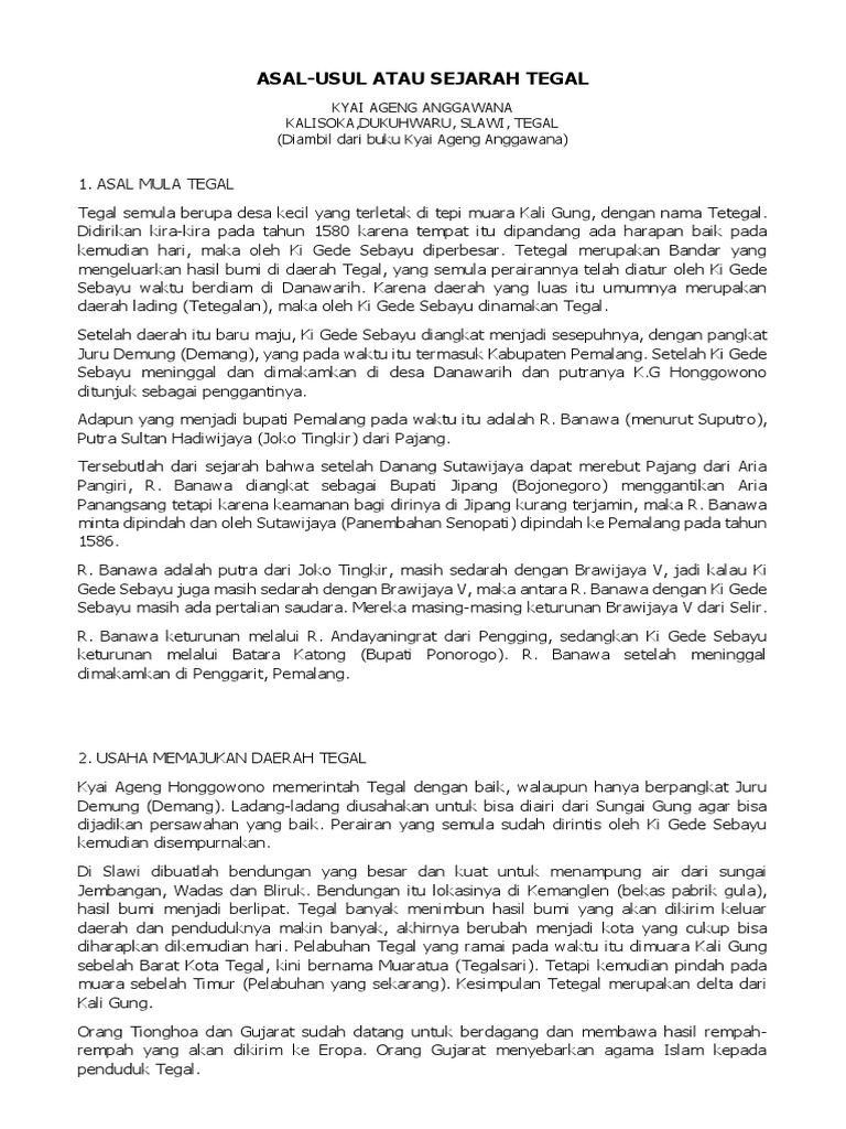 Cerita asal usul kota tegal dalam bahasa jawa. Asal Usul Kutha Tegal Dalam Bahasa Jawa. Aneh wit-witan asem iku thukule rada adoh-adoh utawa arang-arang. Dikisahkan bahwa salah seorang anak putri Ki Gede Sebayu yang bernama Nini Dwijayanti memang terkenal cantik cerdas dan cekatan.