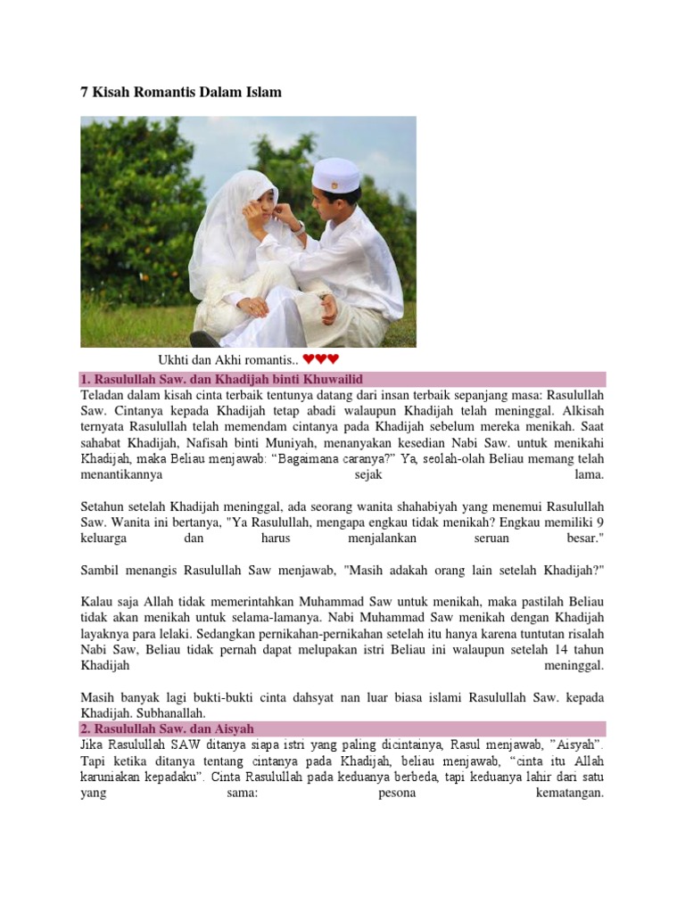 Cerita romantis rasulullah dan khadijah. Barulah pada saat berusia 25 tahun Rasulullah menjalin kerja sama bisnis bersama wanita kaya raya yakni Siti Khadijah. Aisyah tidak pernah mempermudah hukum kecuali jika sudah jelas dalilnya dari al quran dan sunnah. Tidak lama kemudian Hamzah bin Abdul Muthalib bersama Rasulullah datang pada Khuwailid bin Asad bermaksud meminang putrinya itu untuk Rasulullah.