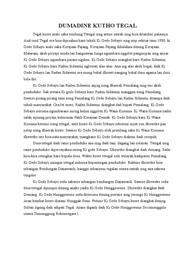 AULIA RAHMADIYAH K - PDF Download Gratis Untitled Sejarah Dan Asal-Usul Kota Tegal Dosen Wisata Legenda Bahasa Jawa. Wacane yakuwe Asal-Usule Kutha Slawi Ki Gedhe Sebayu Wangan Jimat Bendungan Kali Gung Asal-Usule Kutha Tegal Guci Sunan Panggung lan Mbah Gringsing. Ki Gede Honggowono seda diterusna dening putrane sing jenenge Ki Honggowono.