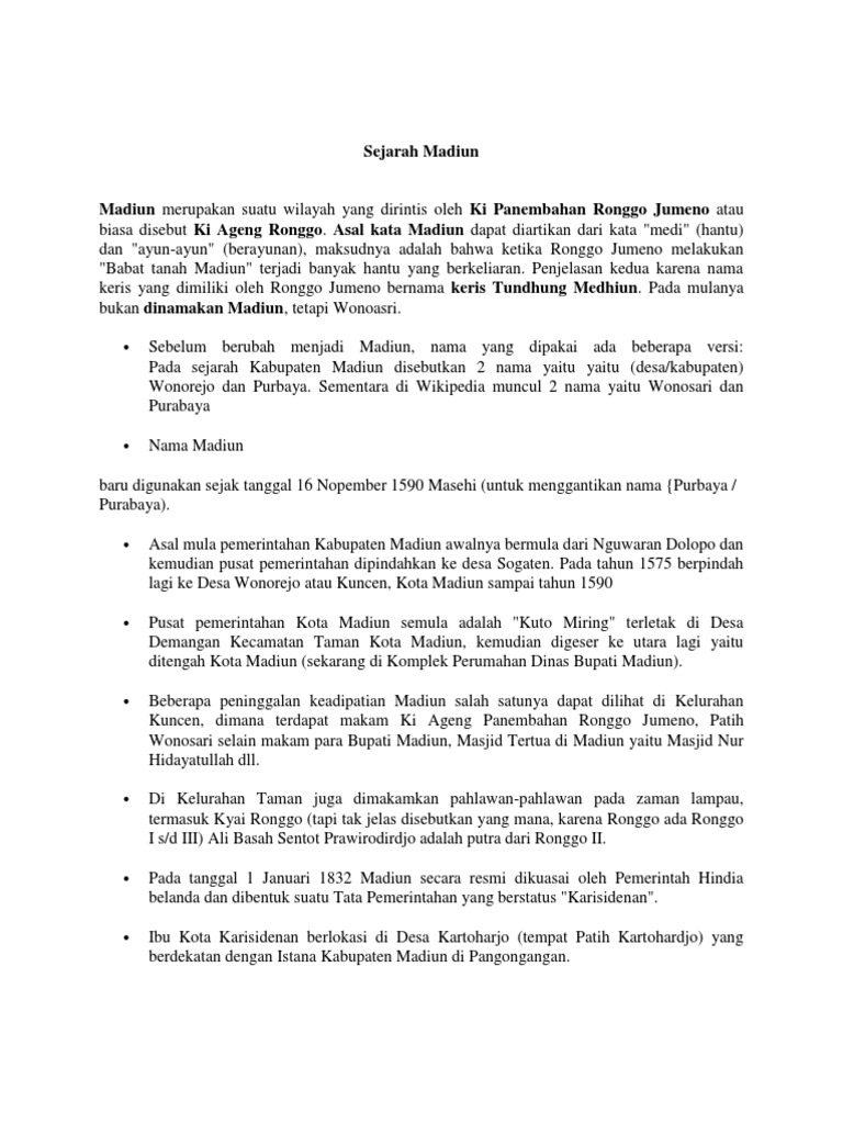 Madiun merupakan wilayah yang dirintis Ki Panembahan Ronggo Jumeno atau biasa disebut Ki Ageng Ronggo. Asal Usul Kota Magetan Jawa Timur. Raja Ajatasatru setelah memeluk agama Budha ia menghadiahkan sebuah.