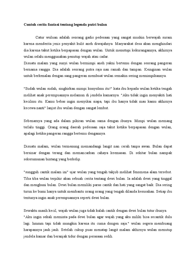 Wajahnya agak suram sebab ia menderita penyakit kulit di wajahnya. Contoh cerita fantasi legenda putri bulan. Salah satunya adalah cerita Putri Serindang Bulan berikut ini.